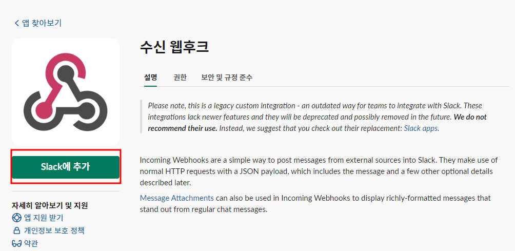 7. 수신 웹후크 통합 앱 추가를 한다.