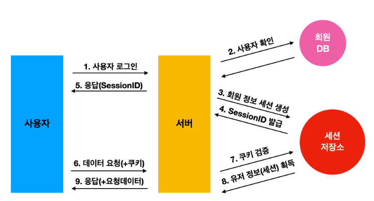 - 서버에서는 클라이언트를 구분하기 위해 세션 ID를 부여하여 웹 브라우저가 서버에 접속해서 브라우저를 종료할 때까지 인증상태를 유지.