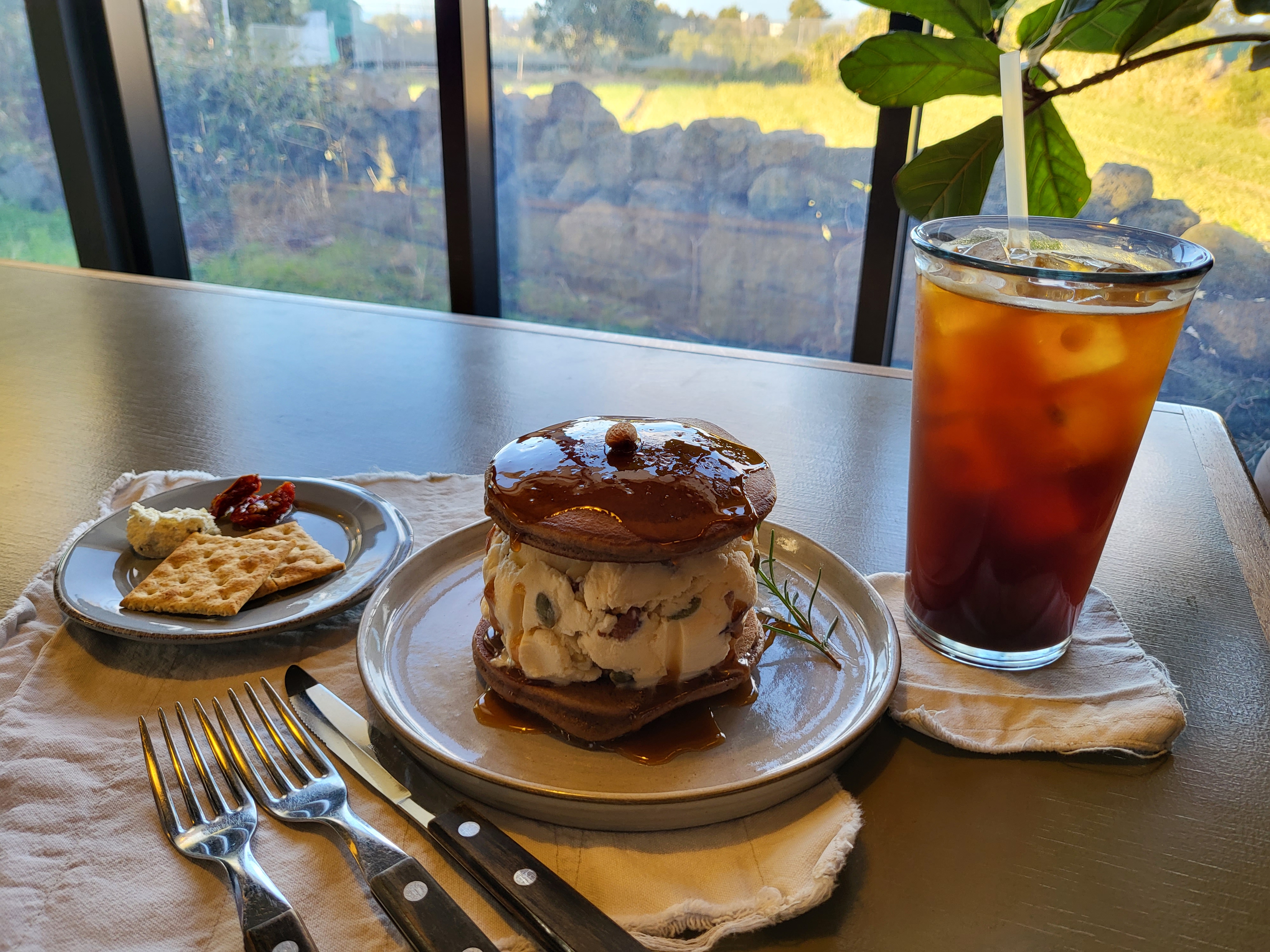 마카롱처럼 덮고 있는 팬케이크 중간에 견과류가 포함되어 있는 바닐라 아이스크림 조합이 정말 좋다.