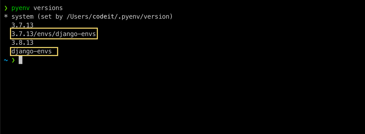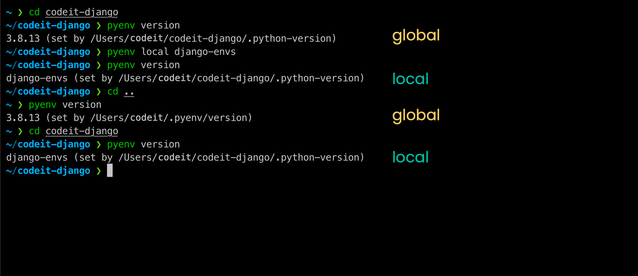 cd ..을 이용해서 상위 디렉토리로 이동한 다음 pyenv version으로 확인을 해보면 이렇게 우리가 global로 적용해 주었던 환경이 적용되어 있죠? 그리고 다시 codeit-django로 들어가면 django-envs 환경이 저장되어 있는 것을 볼 수 있습니다.