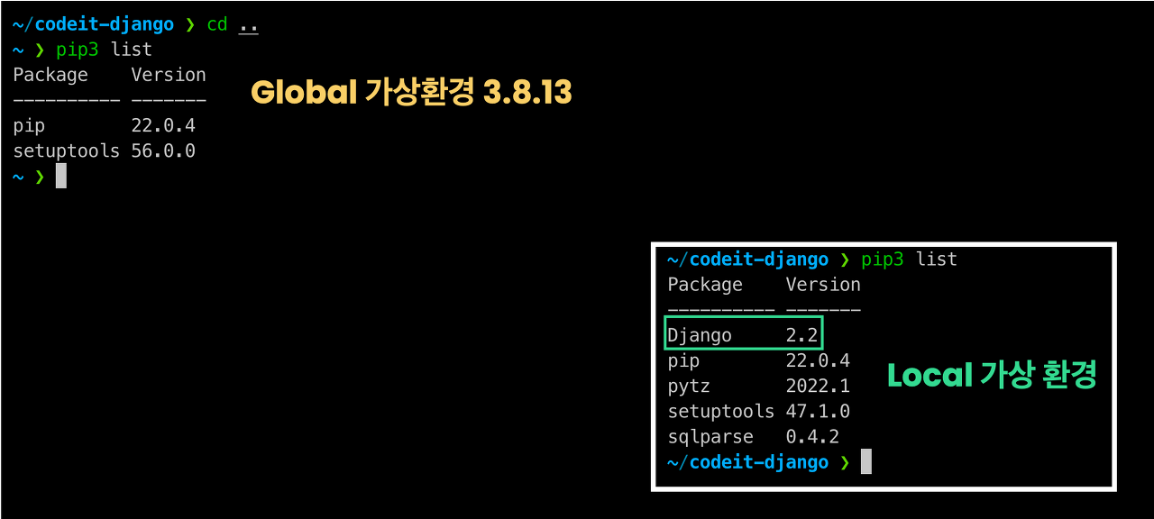 보면 우리가 설치한 django와 django가 필요한 몇 가지 패키지가 설치되어 있는데요. 여기서 cd .. 명령을 통해 하나 상위 디렉토리로 이동해서 다시 한번 pip3 list로 파이썬 패키지 목록을 보면 우리가 설치했던 django가 없습니다.