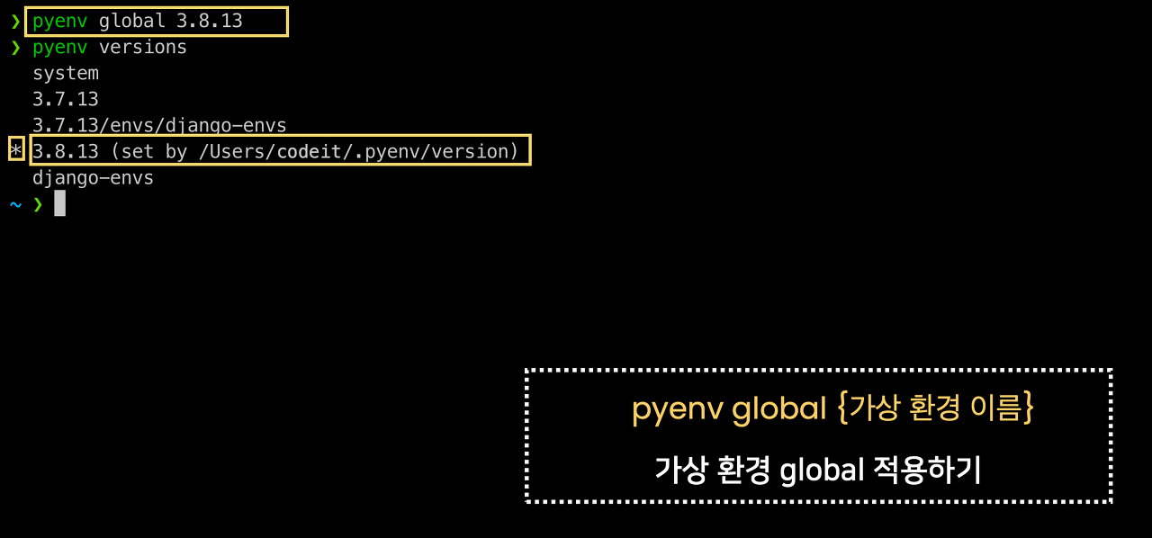 왜냐하면 지금 적용되어 있는 환경은 global 환경으로, global로 지정해둔 3.8.13 환경이기 때문입니다.