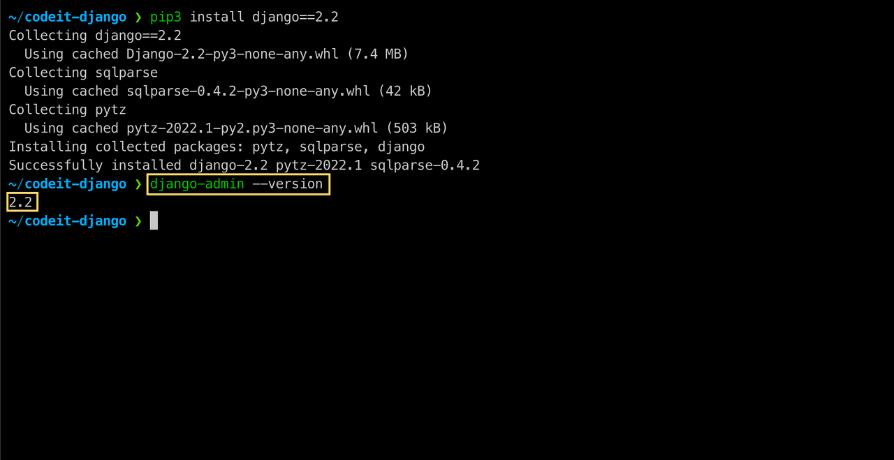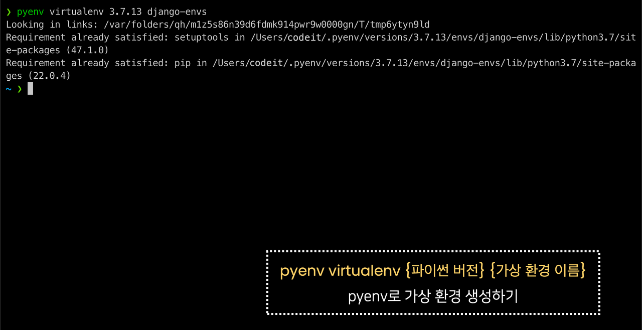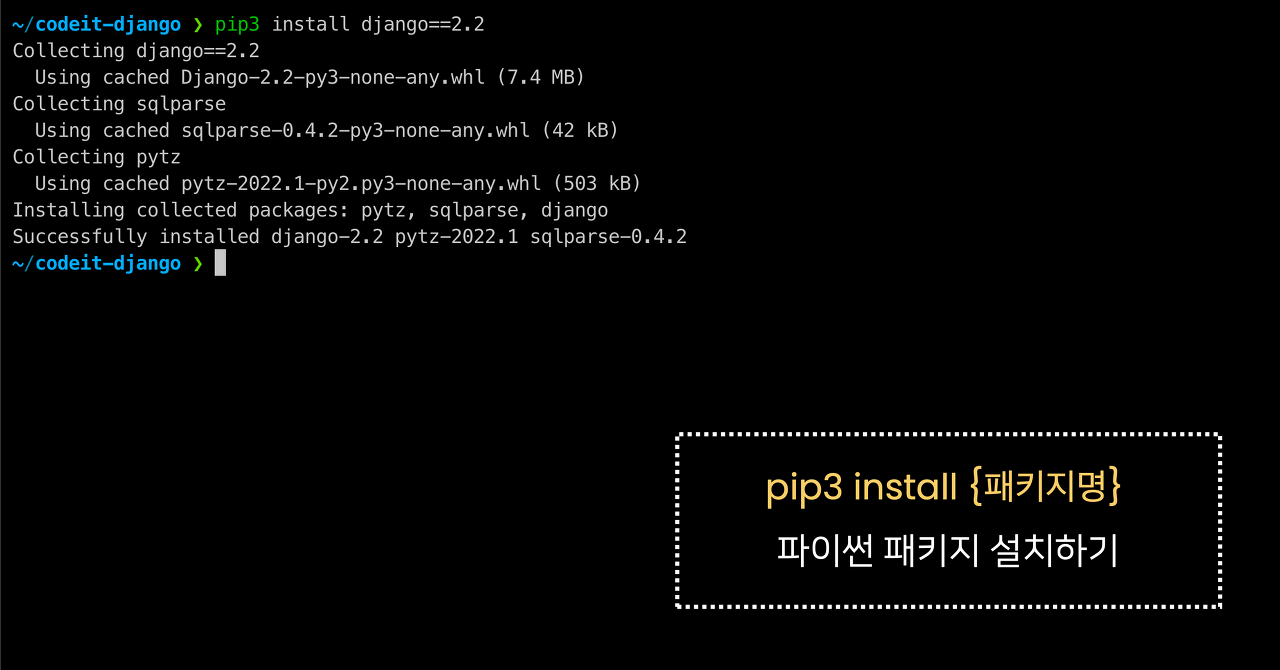 여기서 한 가지 알아두셔야 할 점은 codeit-django 디렉토리에 django를 설치하는 것이 아니라 django-envs 환경에 django를 설치하는 것입니다.