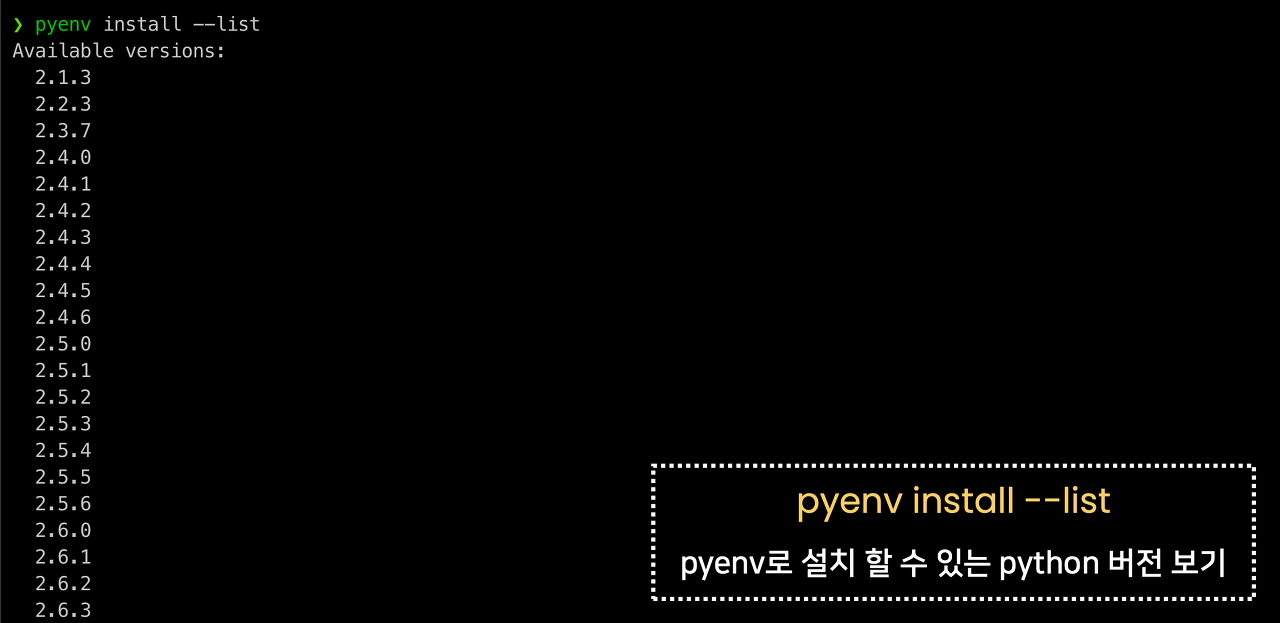 그럼 터미널 또는 WSL을 켜고 pyenv를 이용해서 파이썬을 설치해보겠습니다. 먼저 우리가 설치할 수 있는 파이썬의 버전을 볼까요?